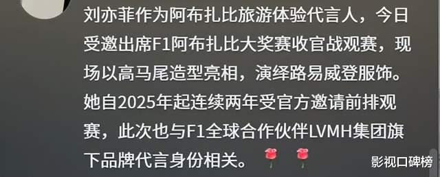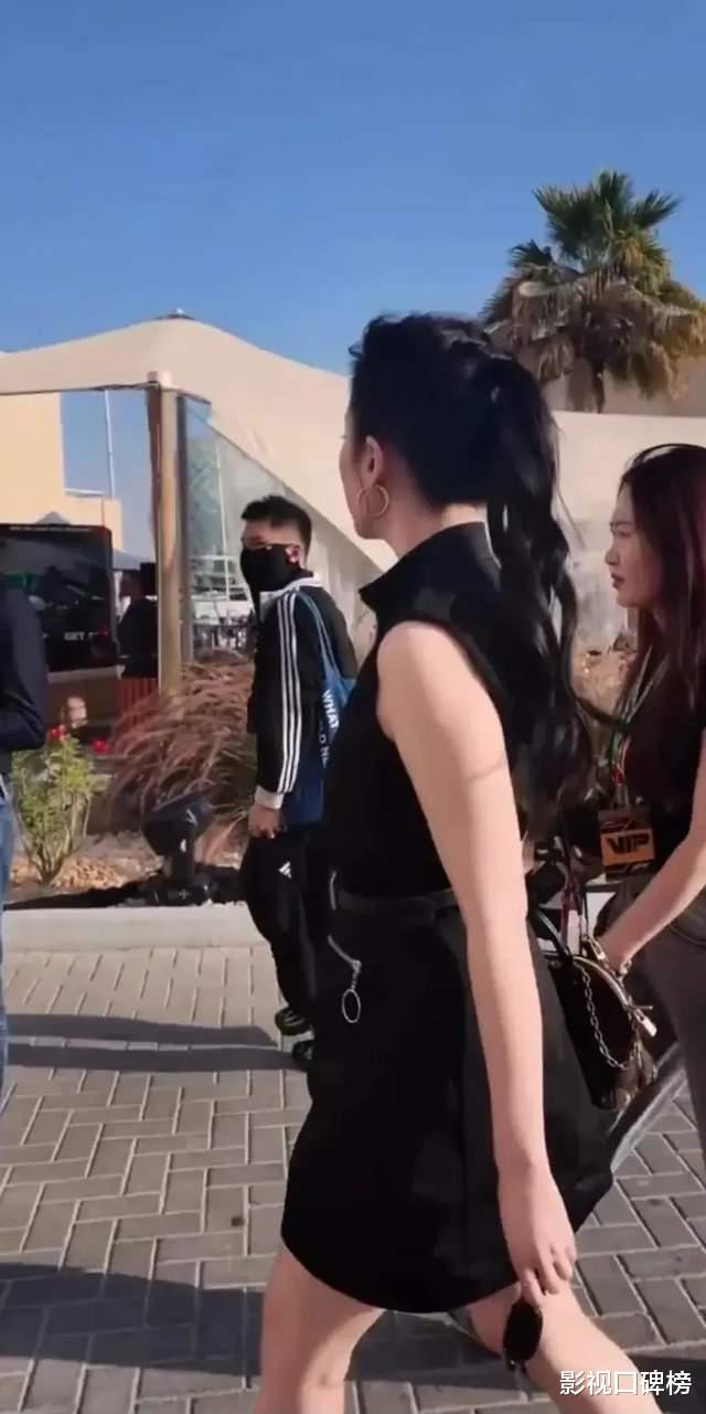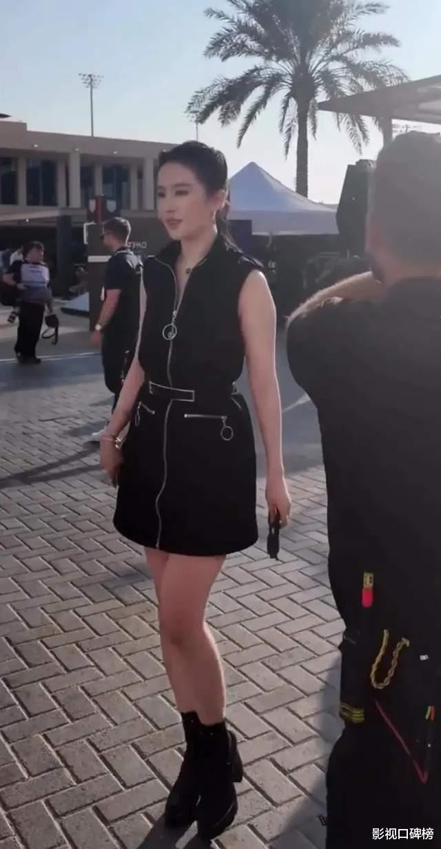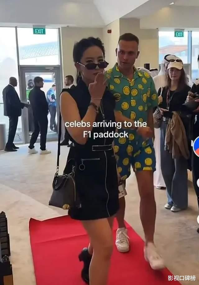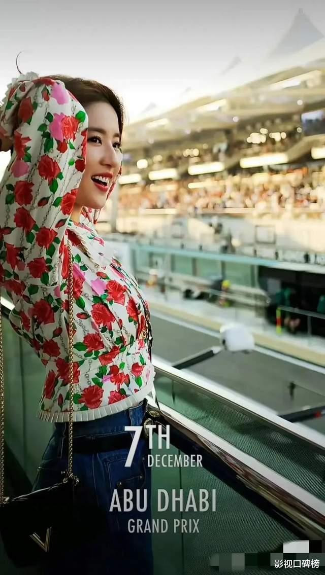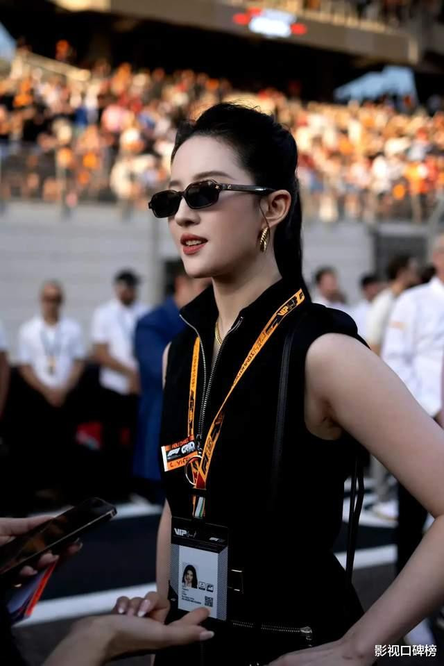 刘亦菲现身阿布扎F1赛车现场, 穿一身名牌, 妆容精致, 颈纹很明显